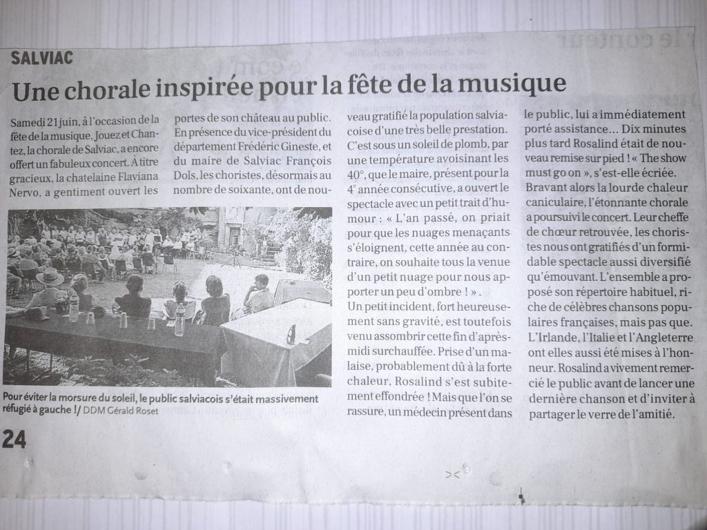 On a vu notamment la chorale de Salviac Jouez et chantez, relever le défi au festival interrégional de Bergerac qui a eu lieu en mai. Cette date restera une date mémorable pour Rosalind Atherton et ses choristes, s’inscrire a été un challenge pour le groupe et ramener un trophée une grande fierté !